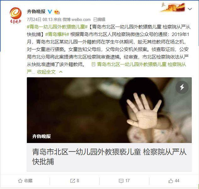 7月23日,据齐鲁晚报报道,青岛市北区检察院通报了一起幼儿园外教猥亵儿童案件。通报称,2019年1月,青岛市北区某幼儿园一外籍教师在学生午休期间,趁无其他教师在场之机,对一女童进行猥亵。女童告知父母后,父母向公安机关报案。侦查取证后,青岛市公安局市北分局将此案提请市北区检察院审查逮捕。经审查,市北区检察院依法批准逮捕了该外籍教师。《每日经济新闻》记者了解到,涉事幼儿园为青岛市市北区红黄蓝万科城幼儿园。