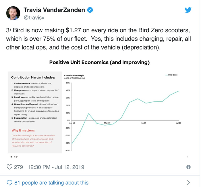 最近大半年,Bird陆续宣布了两个自己开发的定制车型,同样和中国公司OKAI(奥凯)合作生产:Bird One和Bird Zero,在电池和轮胎寿命上有显著提升。本月VanderZanden在Twitter⤴️回应The Information的文章时提到,Bird Zero每次行程都能赚1.27美元,而如今这个车型已经占Bird车辆总数的75%以上。