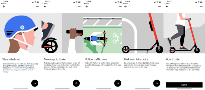 和中国的共享单车类似,共享电滑板车只需通过手机扫码就可以使用,不过如果是新注册账号,app往往会多一个步骤:安全须知,里面包括建议佩戴头盔、驾驶方式、停放方式以及要求消费者遵守交通规则等内容。
