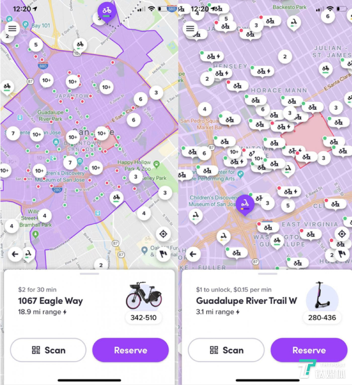 这些主要玩家的总部全都位于加州,整个加州也有十数个城市能看见电动滑板车的身影,主要投放区域都在人流密集的downtown或其他商业中心区、景区。
