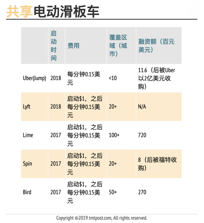 Bird是共享电动滑板车发展最快、体量最大的初创企业之一,迄今为止融资超过2.7亿美元。Lime从共享单车转型共享电动滑板车,总融资额超过7亿美金。