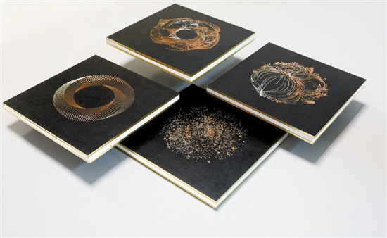整套录取通知书的设计还体现在形式上的共同体。最外层半透明的纸袋,象征山之初的混沌状态;第二层银色纸质的外壳,象征水之茫的镜面效果;第三层墨绿色主调的笔记本封面,象征木之生的自然之势;第四层白色主调的风琴式笔记本内页,象征人之荣的文明之光。