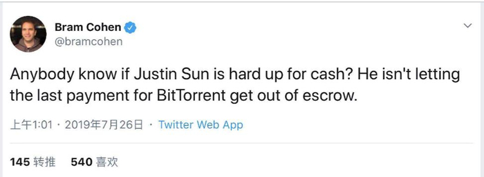 7月26日,BitTorrent创始人布拉姆.科恩在社交媒体称,未收到孙宇晨支付收购尾款,并质问其是否手头现金紧张。
