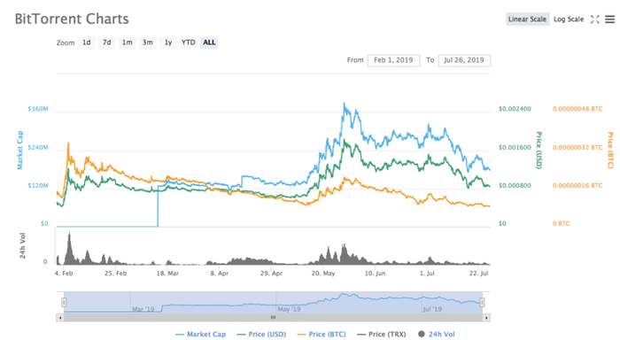 CoinMarketCap显示,BTT的交易对目前在币安、OKEx、火币全球站、Bitfinex及KuCoin等均有流通,目前的价格在0.000843美元,市值为1.7亿美元,现流通量为2121亿个,发币总量为9900亿个。