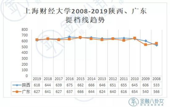 铁马分别选取了东部和西部两个教育水平相对好的省份广东和陕西。我们可以明显看到,2015年前后,这两个省份上海财经大学的提档线几乎都是660分以上,也就是和清华北大差10分的水平,和复旦、上交持平甚至还高。