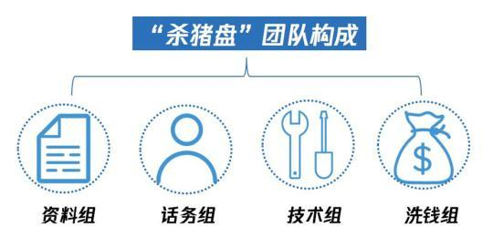 在“杀猪盘”骗局的背后,往往有完整的诈骗团队和工作体系,大体上分为资料组、话务组(钓鱼)组、技术组,以及洗钱组。