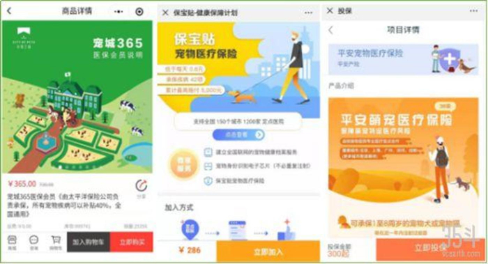 从左到右:宠城365医保会员、tips小贴士宠物医保、陆金所(平安)萌宠医保,35斗搜集
