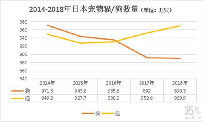 称日本为风向标的原因是因为其在亚洲宠物市场的独特地位。在日本,有约30%的家庭养有宠物。2018年的调查数据显示,日本全国共有890.3万只宠物狗,969.9万只猫。