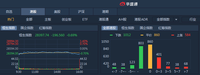 周五,港股市场普跌,主要股指下挫。恒指全日呈现下跌行情,盘初跌幅快速收窄,尾盘又现回跌。恒指跌0.69%,报28397.74点;国企指数跌0.71%,报10853.17点;红筹指数跌0.85%; 恒指本周累跌1.28%。