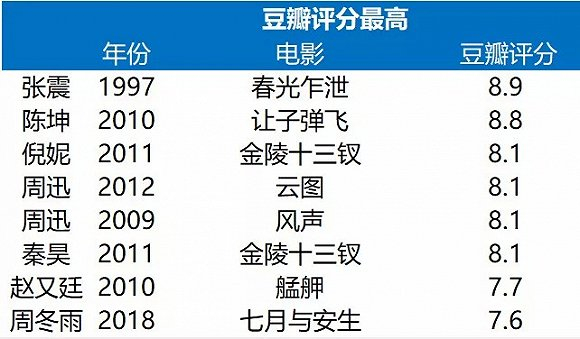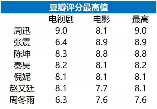 豆瓣评分最高值我们可以看出他们代表作究竟水准如何,除了周冬雨外,这些电影咖的口碑代表作都超过了8分,周迅的《大明宫词》和张震的《春光乍泄》,这两部不少人心目中的经典之作更是达到了9分和8.9分,分别占据了电视剧、电影两个门类的第一名。