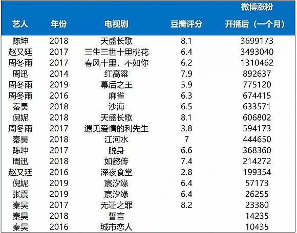 而在微博这一重要的新媒体平台上,电视剧作品也让他们圈了不少粉,陈坤在《天盛长歌》播出后涨粉369.9万人,赵又廷在《三生三世十里桃花》播出后涨粉349.3万人,周冬雨在《春风十里不如你》涨粉131万人,位列“微博涨粉”榜单前三名。