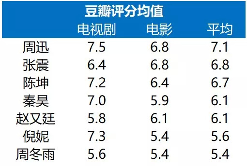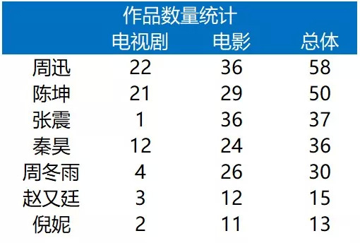 豆瓣评分均值代表了演员作品的整体品质和观众认可程度。无论是周迅、张震,还是陈坤、秦昊在观众心目中都是演技表现相对稳定的口碑演员。倪妮和周冬雨则属于不缺少高口碑代表作,却也出现过不少“有失水准”的作品。