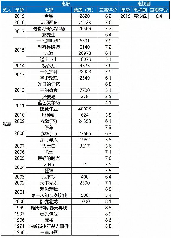 张震在电影作品上起点极高,出道不久就频频与杨德昌、王家卫、李安等名导合作,他口碑最高的作品也基本出现在1991~2000年这一时段,而从2008年~2015年才是他演绎生涯的活跃期,《赤壁》《一代宗师》《绣春刀》等代表作也出自于这段时间内。在2015年后张震的电影作品逐渐变少,相应的也会造成他大众影响力和商业价值的下降,通过接演《宸汐缘》,张震不但扩大了粉丝圈层,也达到了近年来的流量巅峰。