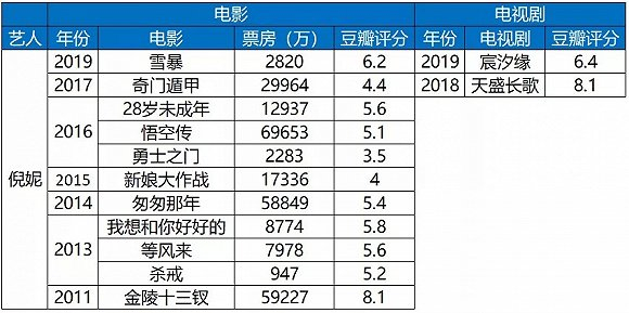 倪妮可以说是出道即巅峰的代表,除了备受赞誉的《金陵十三钗》之外,之后的电影作品都徘徊在5分左右。在产量方面倪妮一直不算太高,活跃期在2013~2016年间。然而从2016和2017年她参演的电影票房与口碑都不太理想,《天盛长歌》又是电视剧领域的顶配之作,这或许是她转型的重要原因。