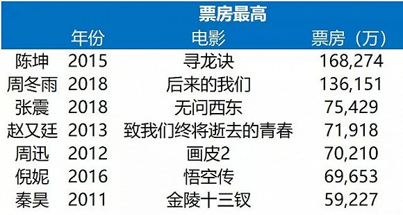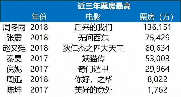 那么,这些电影咖近年来的电影作品表现又如何呢?对比他们所有电影作品的最高票房和近三年电影作品的最高票房,可以明确的发现,除了周冬雨、张震之外,全部都有了一定幅度的下降。陈坤更是在2015年的《寻龙诀》之后再没能拿出叫好又叫座的电影作品,2017年他出演的《美好的意外》票房仅有1762万。
