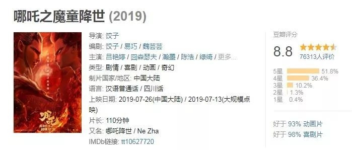 《哪吒》将创国产动画影片的各项纪录已经不用再怀疑。截至7月25日,《哪吒》在豆瓣评分高达8.8分,这不是圈地自嗨,而是超过了7万观众的认证。在更观众向的猫眼和淘票票上,《哪吒》也分别拿下9.7分和9.5分的高分,超过15.9万人和20.9万人想看。灯塔的数据中,《哪吒》的评分暂与《疯狂动物城》持平,登顶动画电影宝座。