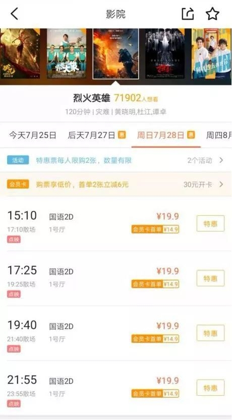 以《烈火英雄》为例,在7月26日这一天,包括耀莱成龙影城(王府井店),百老汇影城(apm购物中心店),中影国际影城(石榴中心店)等在内的北京的104家影城都给出了19.9元的票价。