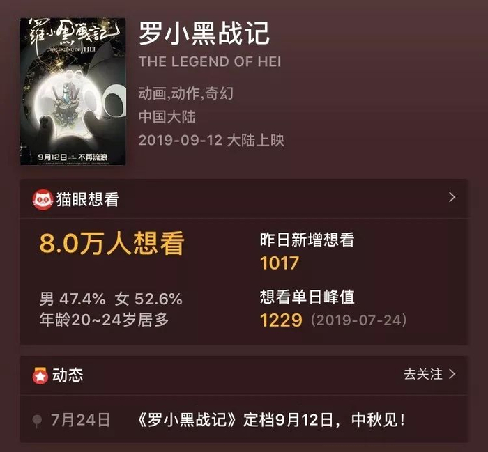 选择《罗小黑战记》这个IP进行大电影的开发,解决了动漫“经费不足”的困扰,引起粉丝期待。影片采用原班人马制作,细节、质感有所保障。在猫眼电影上,有超过7万人标记了“想看”。