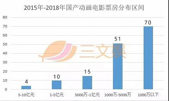 国内一部动画电影成本大约为2000万人民币,而从动画电影票房市场来看,从2015年到2018年,票房收入在千万以下的动画电影数量高达70部,占比46.7%。