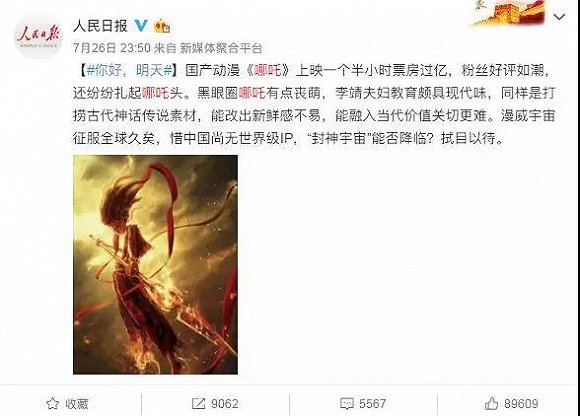 “封神宇宙”初现雏形,就获得了官媒的关注。7月26日,人民日报官方微博深夜发文,表达了对“中国版漫威宇宙”的期待。