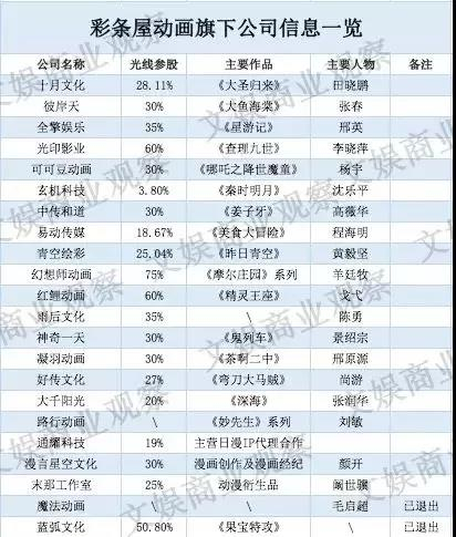 这是一家松散的动漫联盟,他们的共同点是都接受了光线的投资,比例从3.8%到75%不等,大部分维持在20%-40%之间。