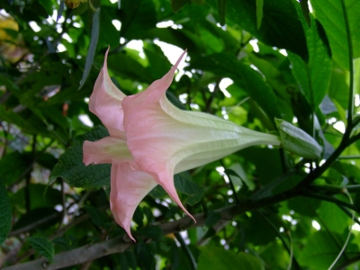 大花木曼陀罗的英文名叫Angel's Trumpet,意为天使号角,有粉白、橙黄、白色不同的栽培品种。大花木曼陀罗并没有什么特殊的香气,能成为佛系的花,当然不是为了用气味来诱惑城市中的红男绿女。这种带着传奇光环的有毒植物,奇特的花型、众多的花量和一年四季反复开花的特点总能让它们收获不少关注的目光。