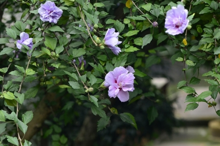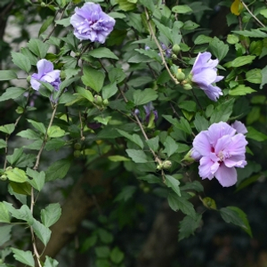 在成都,木槿也算是夏季最为寻常可见的花。不过,和代表着这个城市形象的满城芙蓉相比,木槿在这座城市又显得低调了许多。木槿,是盛夏季的代表花卉,每一朵槿花只开放一天,早晨绽放,晚上调谢,所以也被人称为“朝开暮落花”。《诗经·郑风》说:“有女同车,颜如舜华;有女同行,颜如舜英。”这里的舜华和舜英,指的也是木槿。女子美丽的容貌如同清晨开放的木槿花一样娇艳,舜也通“瞬”,芳华一瞬的美,也许转眼就会凋零。