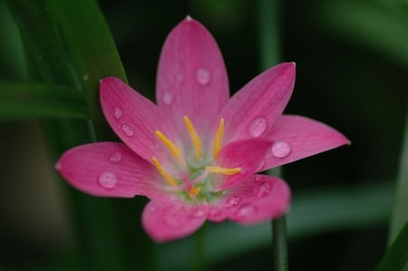 虽然有着诗经植物一般的美好与古老,但是风雨花原产于南美,是石蒜科葱莲属的植物。风雨花的英文名“Rain Lily”,意思便是雨中百合。风雨花是葱莲属多年生球茎类的草本植物,葱莲属植物之所以名字中带着“葱”字,一方面是指这一属植物的叶通常都是狭线形,亮绿色,看起来和小葱的叶极为神似。另外它们在地下有卵形的鳞茎,看上去极似独头蒜。石蒜科的植物总会带着葱蒜味,风雨花的花茎中空,花单生于花茎顶端,花色玫红,于风雨后绽放,极为美丽。