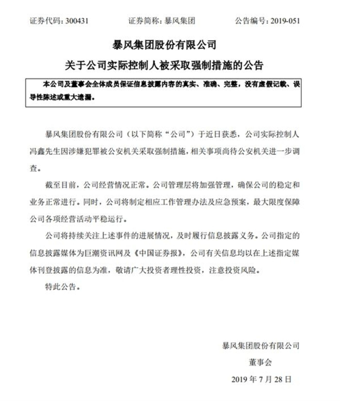 7月28日下午,暴风集团发布公告称,公司实际控制人冯鑫因涉嫌犯罪被公安机关采取强制措施,相关事项尚待公安机关进一步调查。