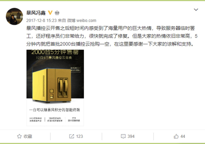 冯鑫在其微博上宣传,播酷云彼时在暴风商城的发售价为4999元的价格,并有38万预约用户,首批2000台5分钟内即售空。