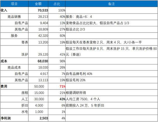 根据调研测算,小佩1个月的单店收入在7万元左右,其中服务收入占到了60%,整个门店运营费用5万元,人员工资在整个收入中占比达到了40%以上,最终算下来整个门店净利润2500元,一旦销售的商品或服务略有下降,那么整个门店将处于亏损状态。具体情况如下: