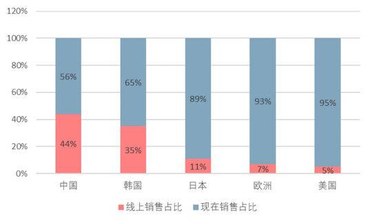 图:各国宠物用品线上线下销售占比