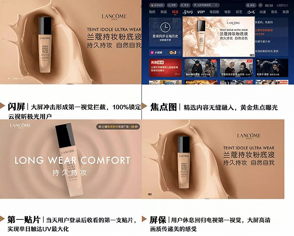 譬如当用户开启腾讯极光TV,兰蔻广告以大屏形式拦截观众的第一视觉,开机闪屏100%锁定潜在客户群;当用户选片时,广告焦点图将于黄金位置曝光,精选内容无缝融入;在观影时刻,第一贴片强势渗透产品基因,实现单日触达UV最大化;即便是终端休息时,高清兰蔻屏保也将作为第一视觉,吸引用户回归电视,传递舒适精美的感受。