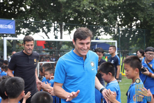 (图:国米功勋球员萨内蒂和塞萨尔与苏宁青训小球员互动)