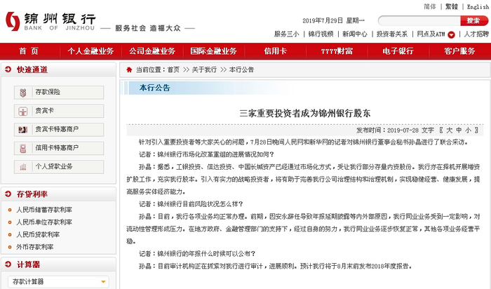 “工行将成为最大股东,另外两家资管公司是央企,间接受财政部管,三家入股是一个好消息。”7月29日,锦州银行北京一网点人士告诉记者,三家战投入股是看好锦州银行发展前景,目前该行理财、存款等业务未受任何影响。锦州银行总部办公室人员及另一家锦州银行网点的内部员工也表示,当前该行业务办理一切如常。