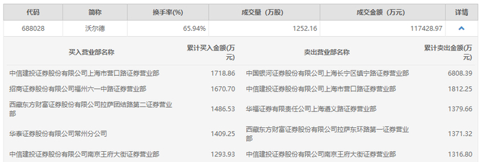 科创板沃尔德换手率近7成 昨日一席位卖出6808万