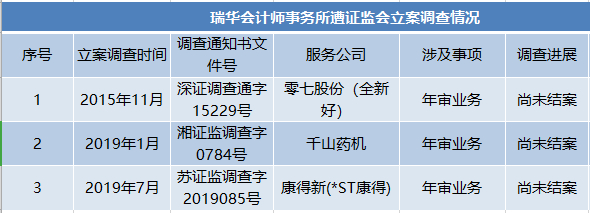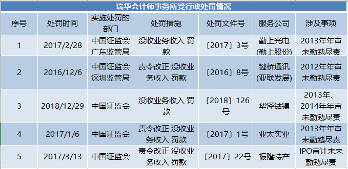 庞大规模客户下,瑞华处罚“缠身”。据证券时报·e公司记者统计,近年来,瑞华共接到5笔行政处罚。此外,公司因零七股份(全新好)、千山药机、康得新(*ST康得)的年审业务分别遭证监会立案调查,此3项调查案均尚未结案。