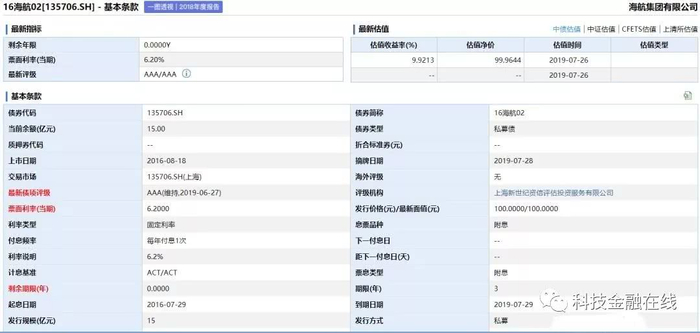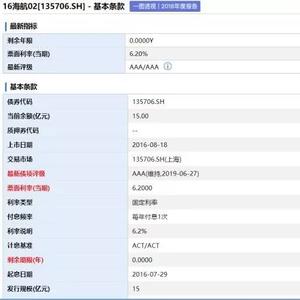 资料显示,16海航02全称为海航集团有限公司非公开发行2016年公司债(第二期),债券代码135706,发行日期为2016年7月28日,发行规模15亿元,债券期限3年,票面利率6.2%。该债券的到期日为2019年7月29日,资金全部用于补充海航的流动资金。