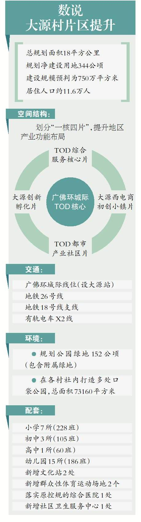 据了解,大源村片区对外交通规划落实广佛环城际线位(设大源站),落实线网规划地铁26号线、地铁18号线支线及有轨电车X2线。规划预留永石路线位、拓宽大源路、优化关键节点。