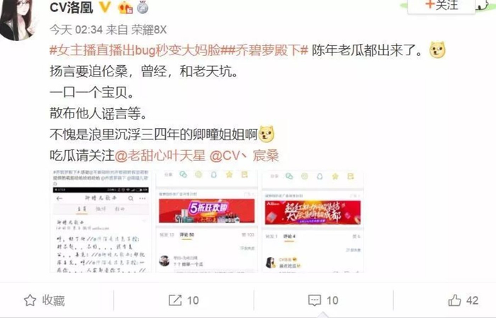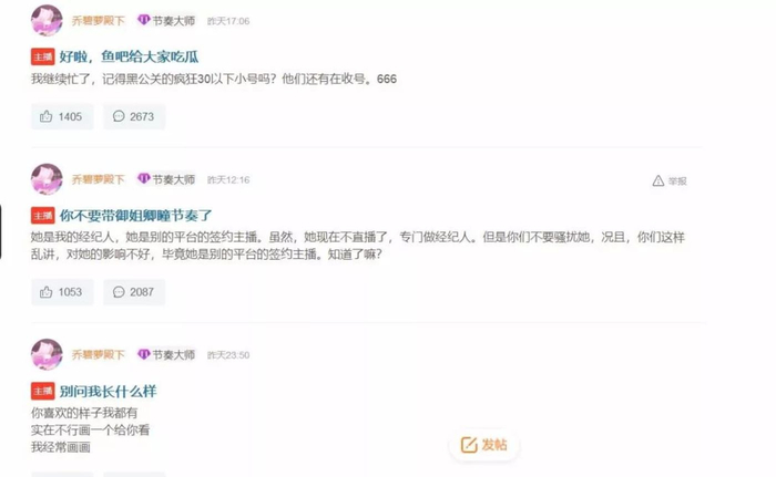 但是乔碧萝没有,她还照样直播,斗鱼鱼吧的动态一天发个几十条,面对各路水友们是脸不红心不跳,你们说你们的,我说我自己的。