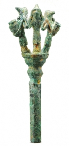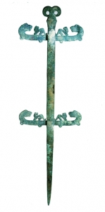 盐源出土的巫师法器,还有一种呈“干”字型的杖形器,主干上满饰云雷纹,枝干上饰以若干回首张望的老虎。