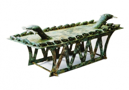 蛇蛙铜案,也称蛇蛙铜俎,俎是古人用来盛放祭品的器具。长方形的案面四周边缘上是32只立体的蹲蛙,案面两端,有两条阳线蛇纹,蛇头上昂,口中衔着一条鱼,蛇身盘桓于案之中部。案脚由两片栅栏形铜片构成,案脚上铸有鱼纹,鱼的骨骼毕露,蛇和鱼的鳞片都十分清晰。