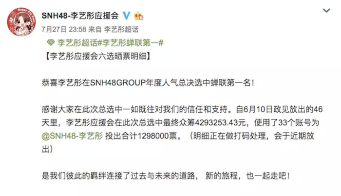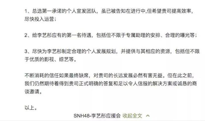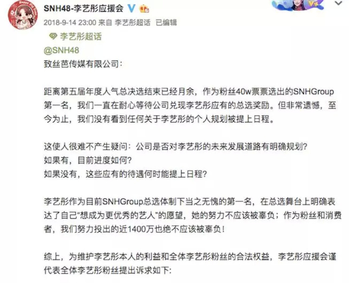 有意思的是,在2018年8月鞠婧祎粉丝的这次喊话后,同年9月,获得了2018年总决选冠军的李艺彤粉丝也通过微博对公司提出疑义,要求提高艺人个人宣发团队的建设与运营效率,安排合理的曝光,以及提供相应的优质资源。