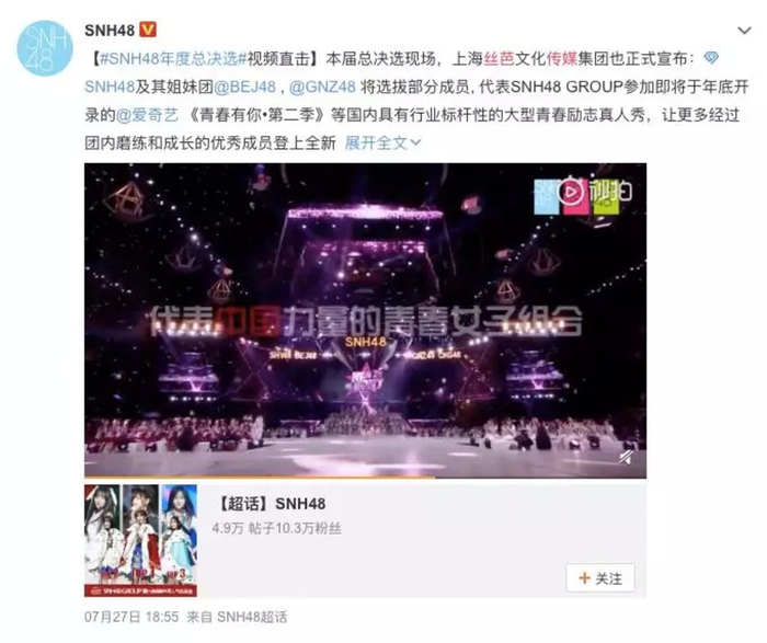 一场“豪赌”在今年总决选落幕后,丝芭传媒官宣SNH48确定参加《青春有你》第二季,这是公司面对第三大危机的一种应对手段。