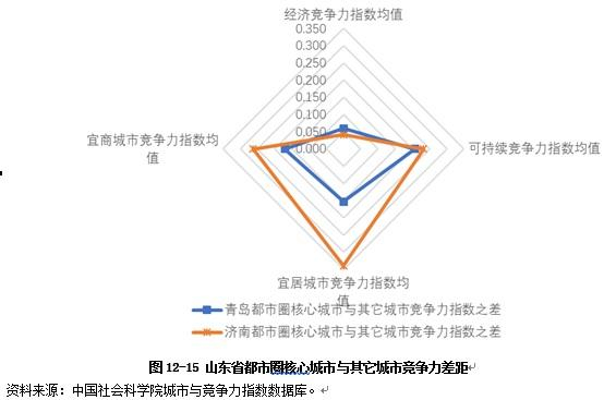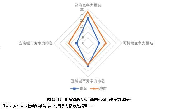 总体上,青岛都市圈竞争力明显强于济南都市圈,不仅青岛自身竞争力明显强于济南,在都市圈的其它城市方面,济南都市圈的城市也与青岛都市圈的城市存在明显差距。