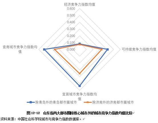 从两大都市圈除核心城市外的城市的竞争力来看(图12-12),除青岛外的青岛都市圈城市的各项竞争力指数均值均高于除济南外的济南都市圈城市,且二者除经济竞争力较为接近外,其它竞争力均差距较为明显,其中可持续竞争力差距相对较小,宜居城市竞争力差距最大,宜商城市竞争力差距介于二者之间。