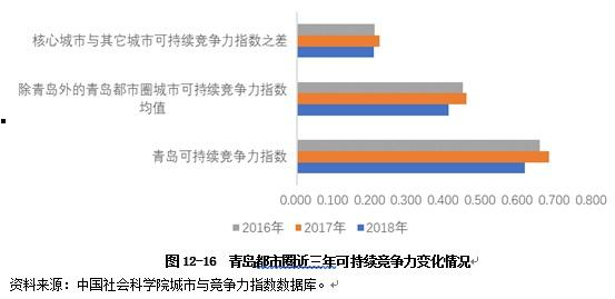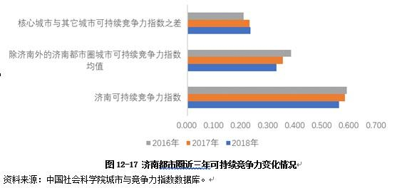 两大都市圈可持续竞争力的不同变化趋势预示着两大都市圈将面临不同的发展趋势(图12-16和图12-17)。青岛都市圈的核心城市和其它城市的可持续竞争力指数近三年来先升后降,有所波动,但其差距三年来基本保持稳定,2018年较2017年还有所缩小,显示出青岛都市圈内城市发展总体保持了一个相对稳定的格局,未来这一趋势也有望延续。而济南都市圈近三年来核心城市和其它城市的可持续竞争力指数均逐年下降,同时差距却逐年扩大,显示出了都市圈内城市发展分化的趋势。