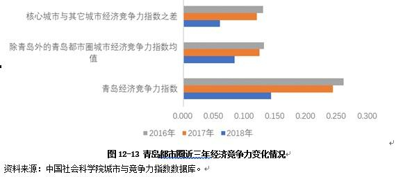 近年来两大都市圈经济竞争力均趋下降近三年来,山东省两大都市圈核心城市和其它城市的经济竞争力均有逐年下降的现象(图12-13和图12-14),且都市圈内核心城市与其它城市间的经济竞争力指数的绝对差距也同步缩小,但从相对比例来看,2018年核心城市较其它城市的领先优势进一步扩大,其中青岛经济竞争力指数与青岛都市圈其它城市经济竞争力指数均值之比,由2017年的1.97下降至2018年的1.71,济南经济竞争力指数与济南都市圈其它城市经济竞争力指数均值之比,由2017年的1.79下降至2018年的1.57。