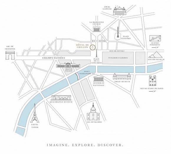杜乐丽花园中的摩天轮拆除后,协和广场附近已经看不到任何高层建筑。广场边上伫立着一对柱式双子宫殿,这是世界顶级建筑师 Ange-Jacques Gabriel(1698-1782) 的杰作。这两栋宫殿按路易十五世的要求所兴建,之后成为 Count de Crillon 家族府邸。恢弘大气并带有巴黎人独有的浪漫色彩,双子楼就这样伫立于协和广场一侧,见证了两代君王的更替、法国大革命,到拿破仑帝国的兴衰以及《凡尔赛条约》之下国际联盟的诞生(1946年解散)。1909年,由建筑师华特·安德鲁(Walter-André Destailleur)将其中一栋改建成了酒店,沿用了 Crillon 家族名称,取名为克利翁大饭店。