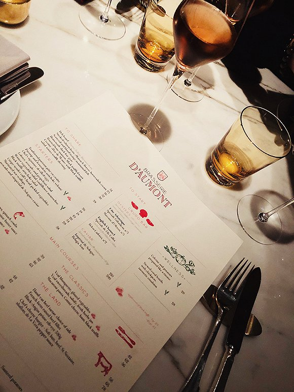 此行没吃到 2018 新晋米其林一星的 L’Ecrin,在全日餐厅 Brasserie d Aumont 吃了一顿晚餐。作为 Fine Dinning 来说,服务员的领位、介绍、侍酒、换盘都做的到位。口味方面,点了鹅肝冷盘、生蚝以及五分熟牛眼肉。印象较好的是生蚝吧,不过显厨艺和食材的牛眼肉并没有让人惊艳,有些可惜。